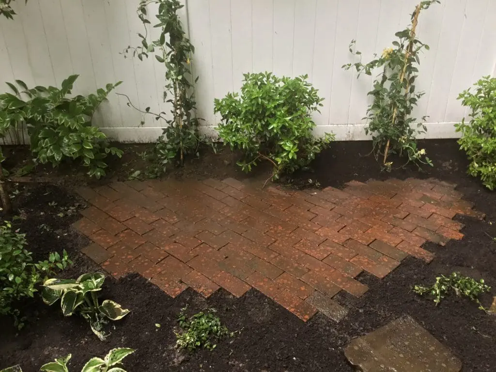 On this property, the dominant landscape feature was a raised brick terrace or patio. The common red brick gives a busy impression which makes the patio appear smaller than it actually is. The color is also…common and drab.